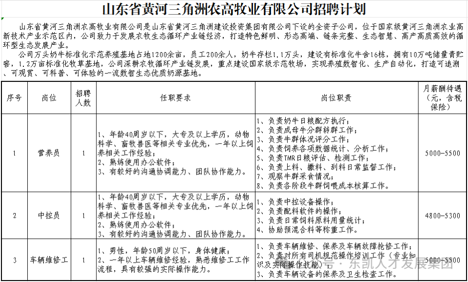 2.工资待遇按照山东省黄河三角洲农高牧业有限公司相关要求发放,按照相关规定缴纳社会保险。