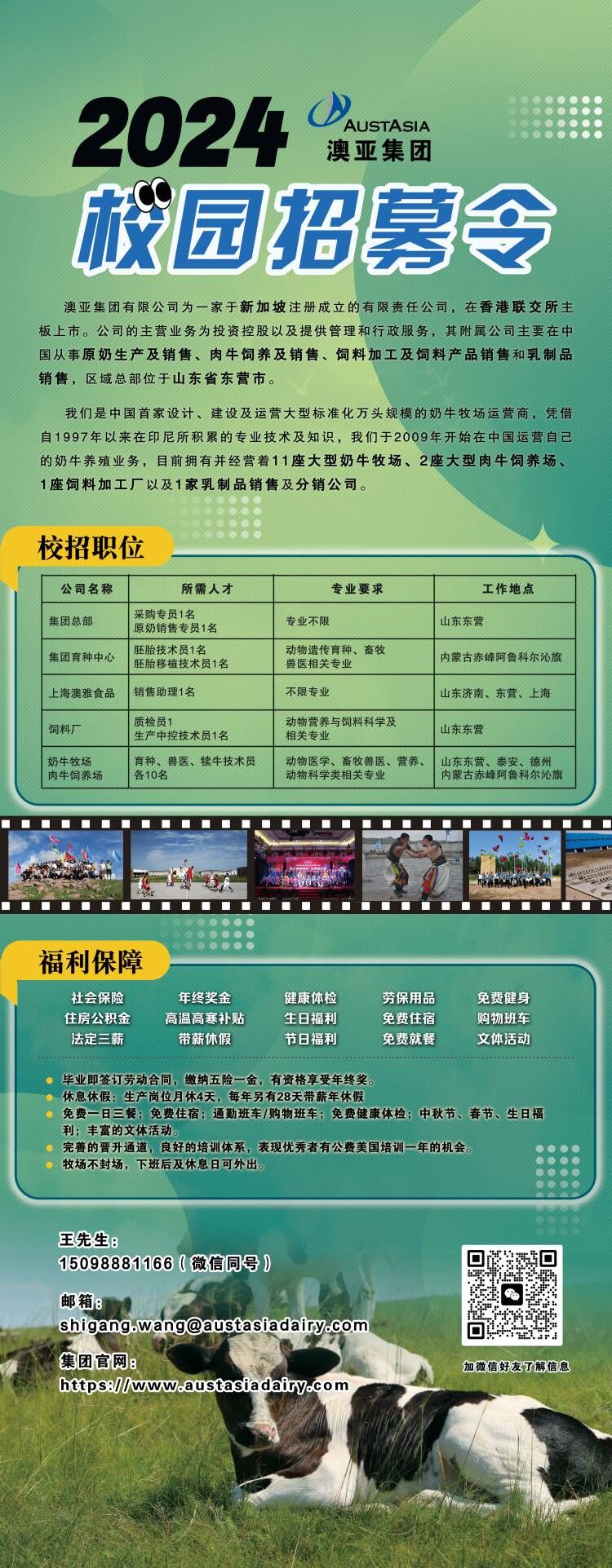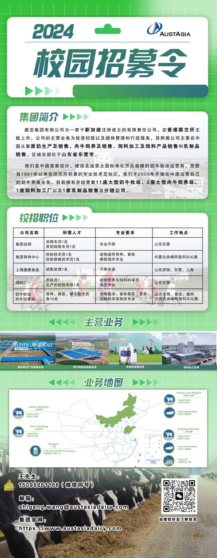 1.育种、兽医、犊牛技术员各10名。 动物医学、畜牧兽医、营养、动物科学类相关专业。