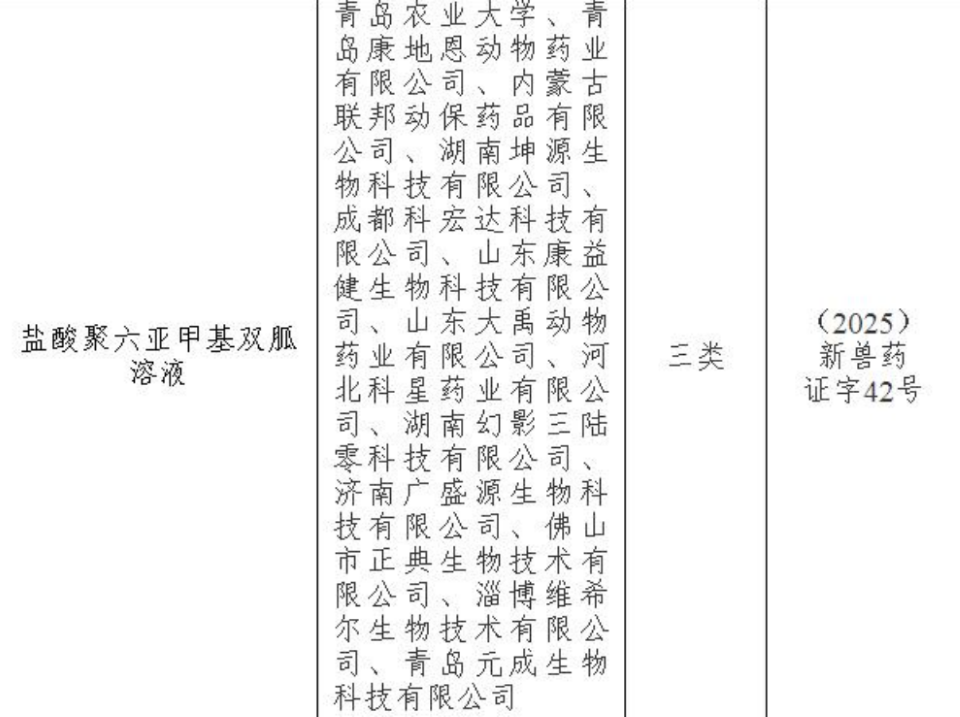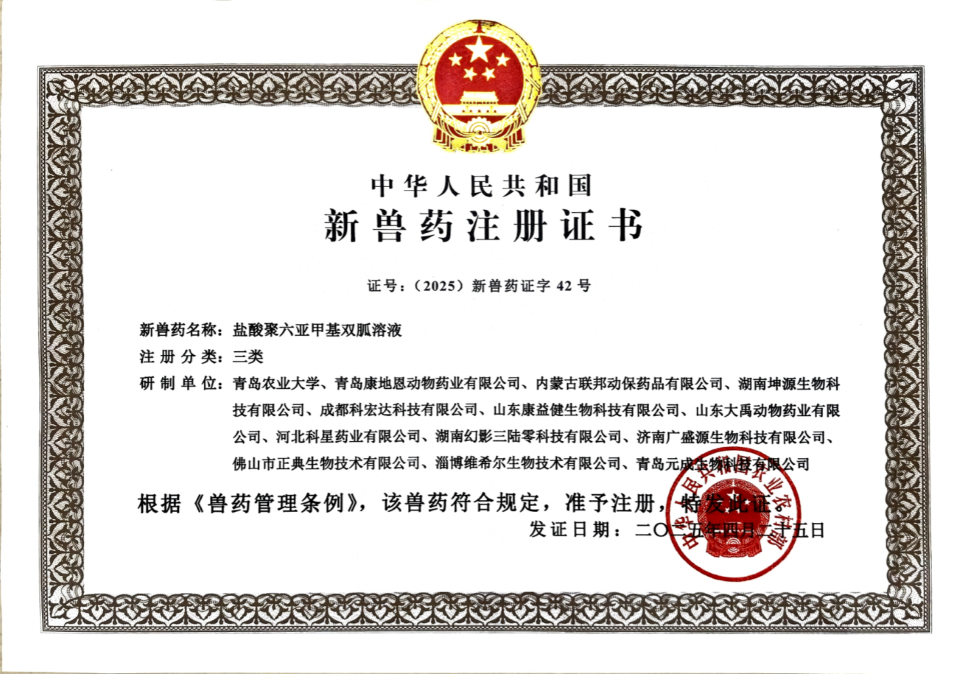4月27日,农业农村部发布第901号公告,由beats365唯一官网入口官网动物疫病防控制剂创新团队秦志华老师联合青岛康地恩动物药业等国内动保企业共同研发的新兽药“盐酸聚六亚甲基双胍溶液”,喜获国家三类新兽药证书,新兽药证书号为(2025)新兽药证字42号。