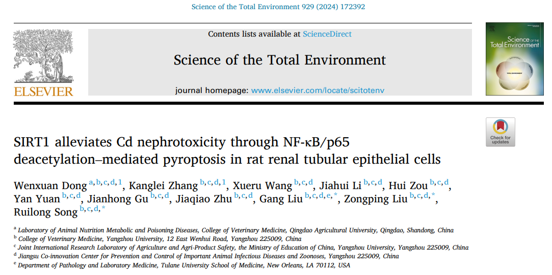 镉是一种广泛分布的环境污染物,严重威胁畜禽生长,对肾脏的损伤尤为严重。团队为阐明镉诱导的肾毒性机制,对镉诱导的炎症反应和细胞焦亡进行研究。以原代大鼠近端肾小管细胞和经镉处理的大鼠的肾组织为模型,发现镉诱导的肾毒性与NLRP3炎症小体激活相关,导致促炎细胞因子表达和分泌增加,以及焦亡相关基因上调,通过调控Sirt1表达可显著抵消镉诱导的 RELA/p65/NLRP3 通路激活,调控细胞焦亡发生。该发现首次揭示 SIRT1 触发的 p65 脱乙酰化对细胞焦亡的重要作用及其对镉诱导的慢性肾损伤的保护作用的研究。