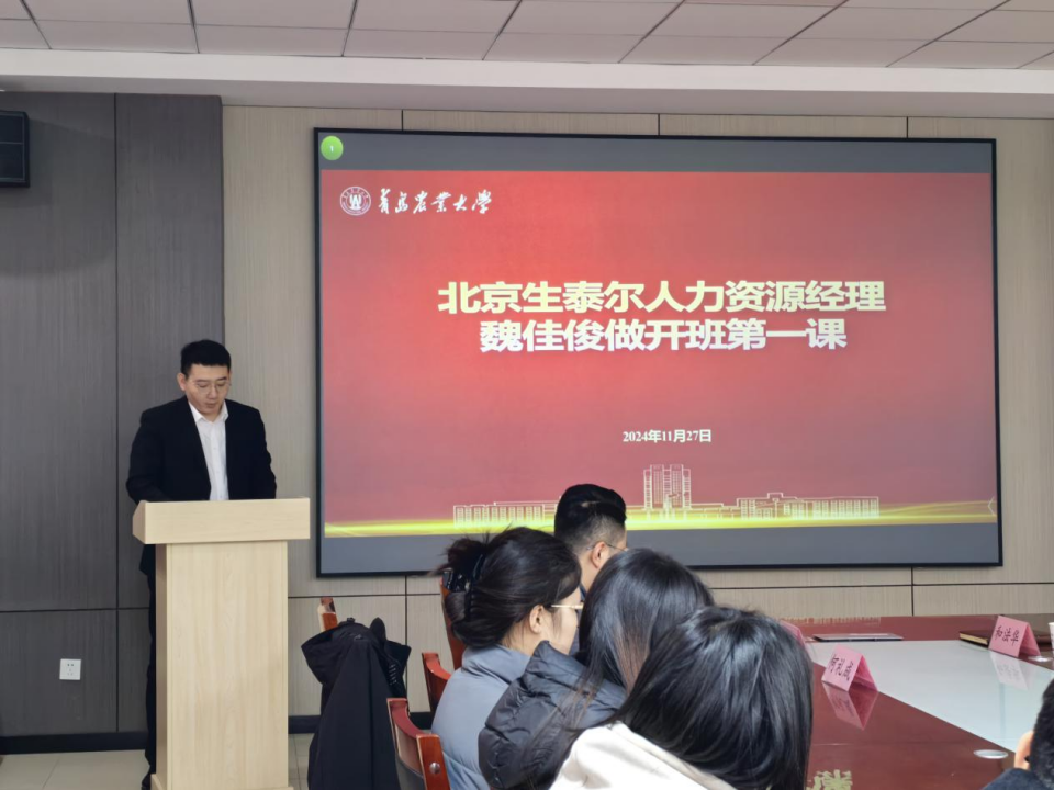 北京生泰尔人力资源经理魏佳俊对生泰尔班的开设表示热烈祝贺,并为生泰尔班学员上“开班第一课”。他向“生泰尔班”的同学们介绍了公司2023年取得的主要成就和公司的岗位招聘要求以及岗位设置,并向学员们提出了几点期望:一是要充分利用产学研一体的学习模式,通过实际操作提升自己的专业素质,为将来的职业生涯做好准备;二是要保持积极的学习态度,不断更新自己的知识体系,关注动物医学行业的发展趋势,了解市场需求,适应行业快速发展的需求,勇于面对挑战,不断追求卓越;三是要为了动物健康和动物源性疾病继续努力,关爱动物健康,保障人类健康。