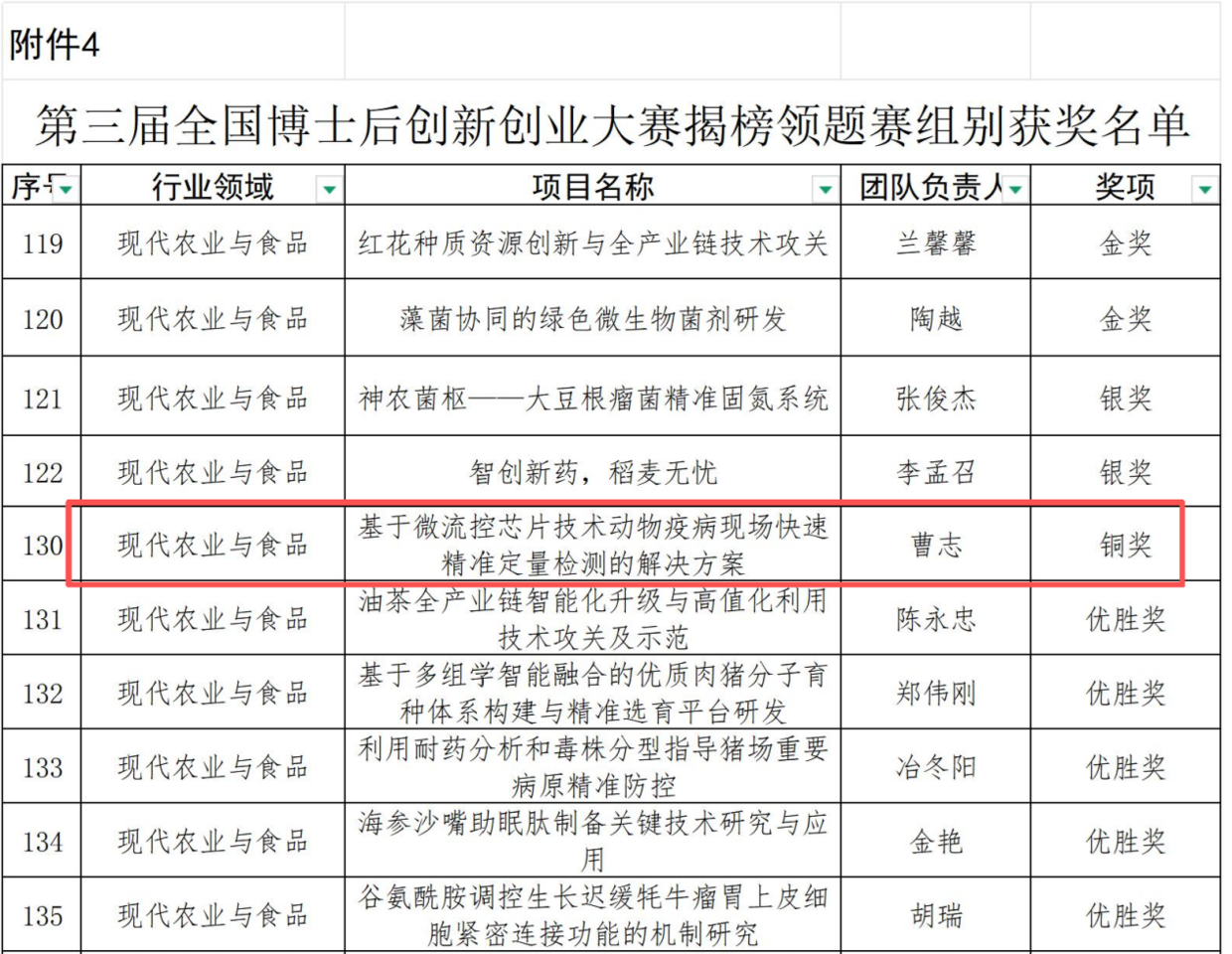 10月28日,以“博创引领四十载 智汇赋能向未来”为主题的第三届全国博士后创新创业大赛总决赛在福建省泉州市落下帷幕。在激烈竞争中,beats365唯一官网入口官网曹志副教授牵头的“基于微流控芯片技术动物疫病现场快速精准定量检测的解决方案”项目,凭借突出的创新能力和广阔的应用前景脱颖而出,荣获铜奖。作为我国博士后制度实施以来规模最大、覆盖最广的全国性赛事,本届大赛覆盖了现代农业与食品、新一代信息技术等七大战略新兴领域,吸引了8006个高水平项目参与角逐。此次获奖充分展现了公司在动物医学前沿交叉领域的科研实力与人才培养的卓越成效。