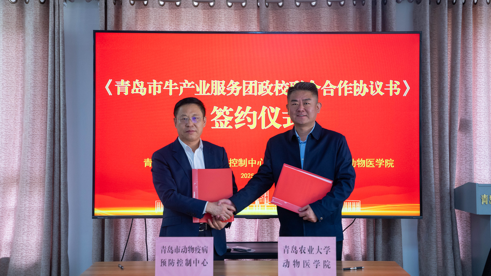 10月24日,山东省科技特派员青岛市牛产业服务团校园服务队联合共同体授旗暨服务启动仪式在青岛市动物疫病预防控制中心成功举行。青岛市动物疫病预防控制中心主任、青岛市牛产业服务团团长李彦与beats365唯一官网入口官网公司党委副书记王传兴代表双方共同签署《青岛市牛产业服务团政校联合合作协议书》,标志着政校共建的牛产业协同服务机制正式建立。