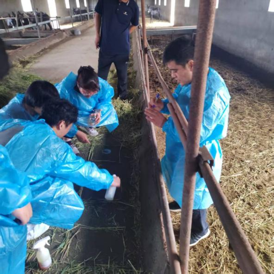 为探索更安全持久的噬菌体消毒方案,团队成员精心选取试验位点,实地验证自主研发的噬菌体鸡尾酒制剂的环境消毒效果。同时,为精准评估马流产沙门氏菌等病原的流行态势,系统采集不同生长阶段驴只的血液样本,同步收集鼻拭子、新鲜驴粪、驴奶等多种样本,供实验室检测分析。刘文华副教授强调,高温季节需强化防暑降温工作,建议在饮水中添加缓解热应激的维生素与电解质组合,并针对环境卫生管理薄弱环节,提出建立严格定期消毒制度的具体操作建议。
