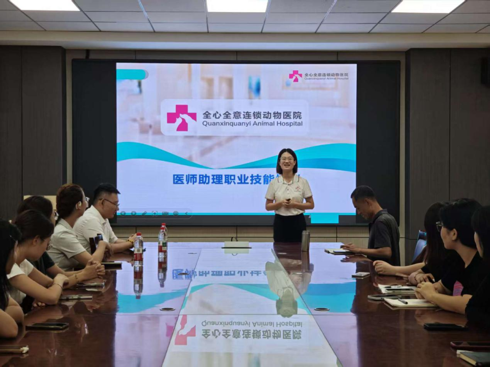 施展为学员们进行了系统培训,详细介绍了全心全意连锁动物医院的发展历程、企业文化和组织架构。她重点讲解了医师助理的基础操作规范与临床实践要求,帮助员工对动物医疗行业的实际操作形成更直观的认识。施展还介绍了医院为实习生提供的各类岗位及其相应待遇要求,表示企业将为优秀实习生提供完善的职业发展通道。